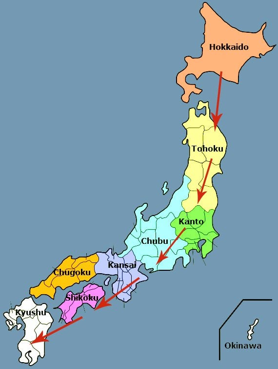 The map shown below indicates that how the autumn foliage season of Japan goes downward from the top elevations. Typically, Japan’s autumn foliage season starts in mid September in the Hokkaido region.